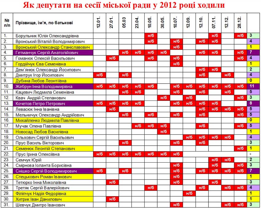 Хто з депутатів найбільше сесій міськради у 2012 році "прогуляв"? (+ таблиця відвідуваності)