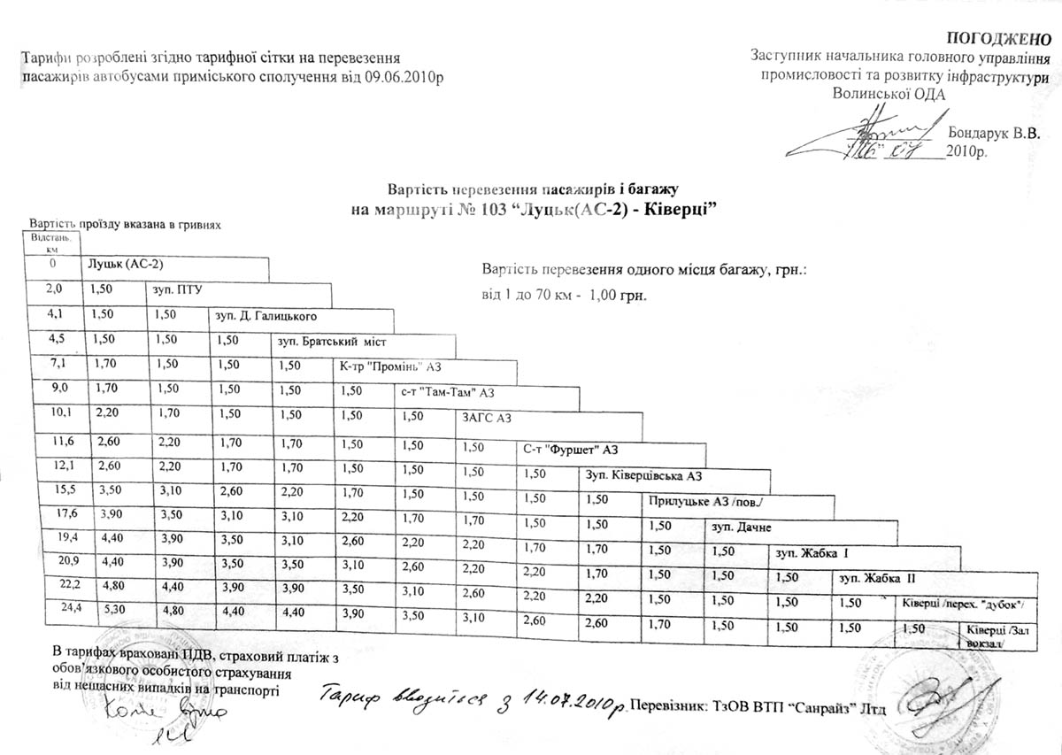 На фото ліворуч - офіційна папера, що регулює вартість проїзду у 103 маршрутці (детально розписана по усіх зупинках)З "кінця в кінець" (24,4 км) - 5,30 грн